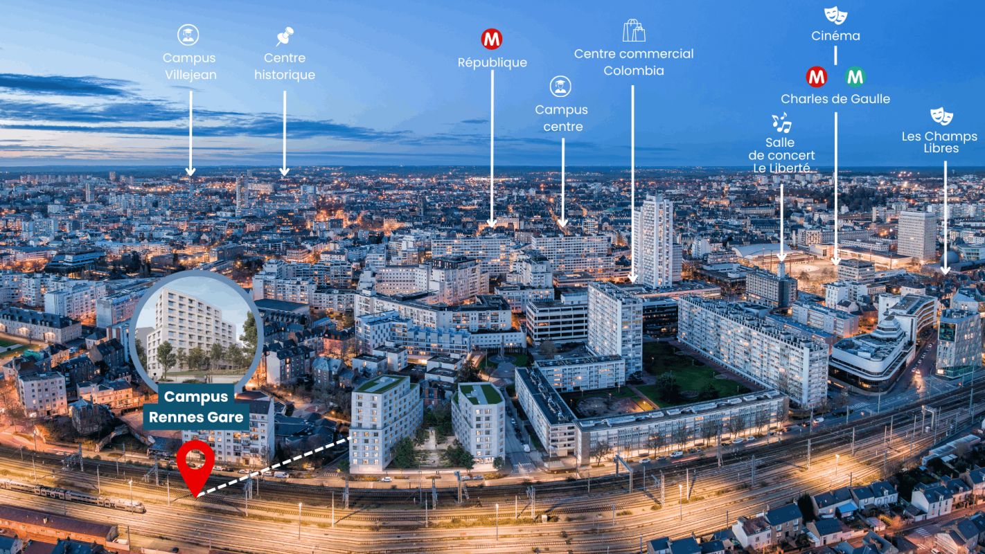 Rennes, l’une des villes les plus attractives de France, offre un cadre dynamique à seulement 50 minutes de la Côte d’Émeraude. Implantée au cœur du quartier Gare – Colombier – Champs de Mars, la résidence bénéficie d’une situation idéale, à proximité immédiate des transports, des écoles, des commerces et des lieux culturels. « CAMPUS RENNES » s’intègre harmonieusement dans le tissu urbain et affirme une identité moderne respectueuse de l’environnement. Le projet, dont les travaux ont déjà démarré, est porté par deux promoteurs nationaux de référence : Lamotte et Bati‑Armor.